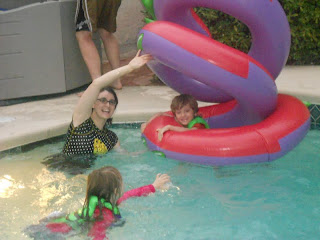 We finished off the evening with a swim in the pool. So much fun! We were glad to see that the pool has a locked fence around it. (Tim w/ JJ, Angela w/ Audrey, Mark)